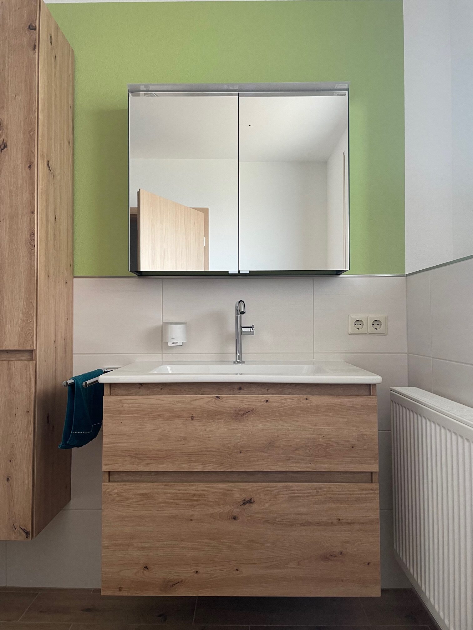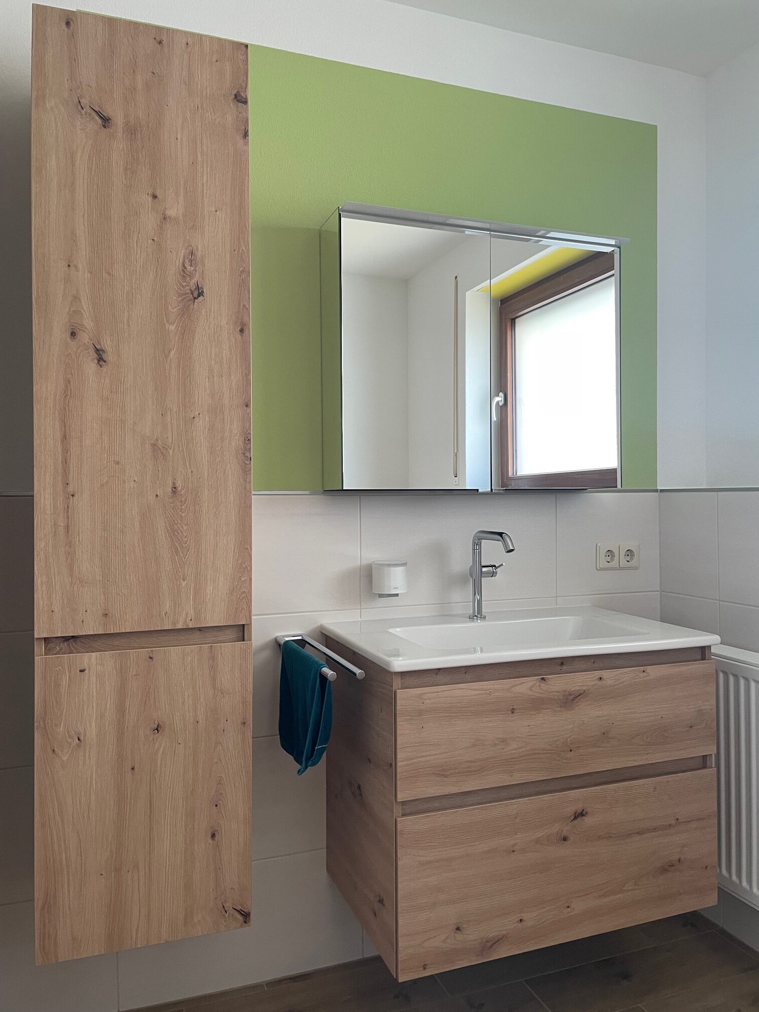 Frische Farben in grün geben dem Bad Behaglichkeit, bei der man sich gar nicht beeilen möchte, sondern lieber noch ein bisschen verweilen.