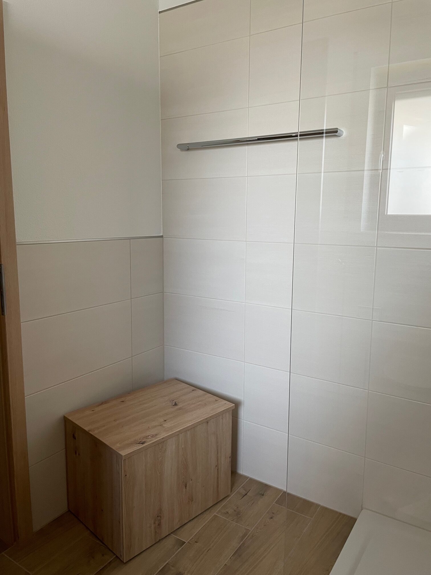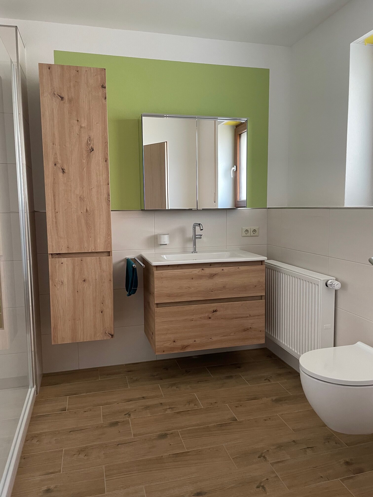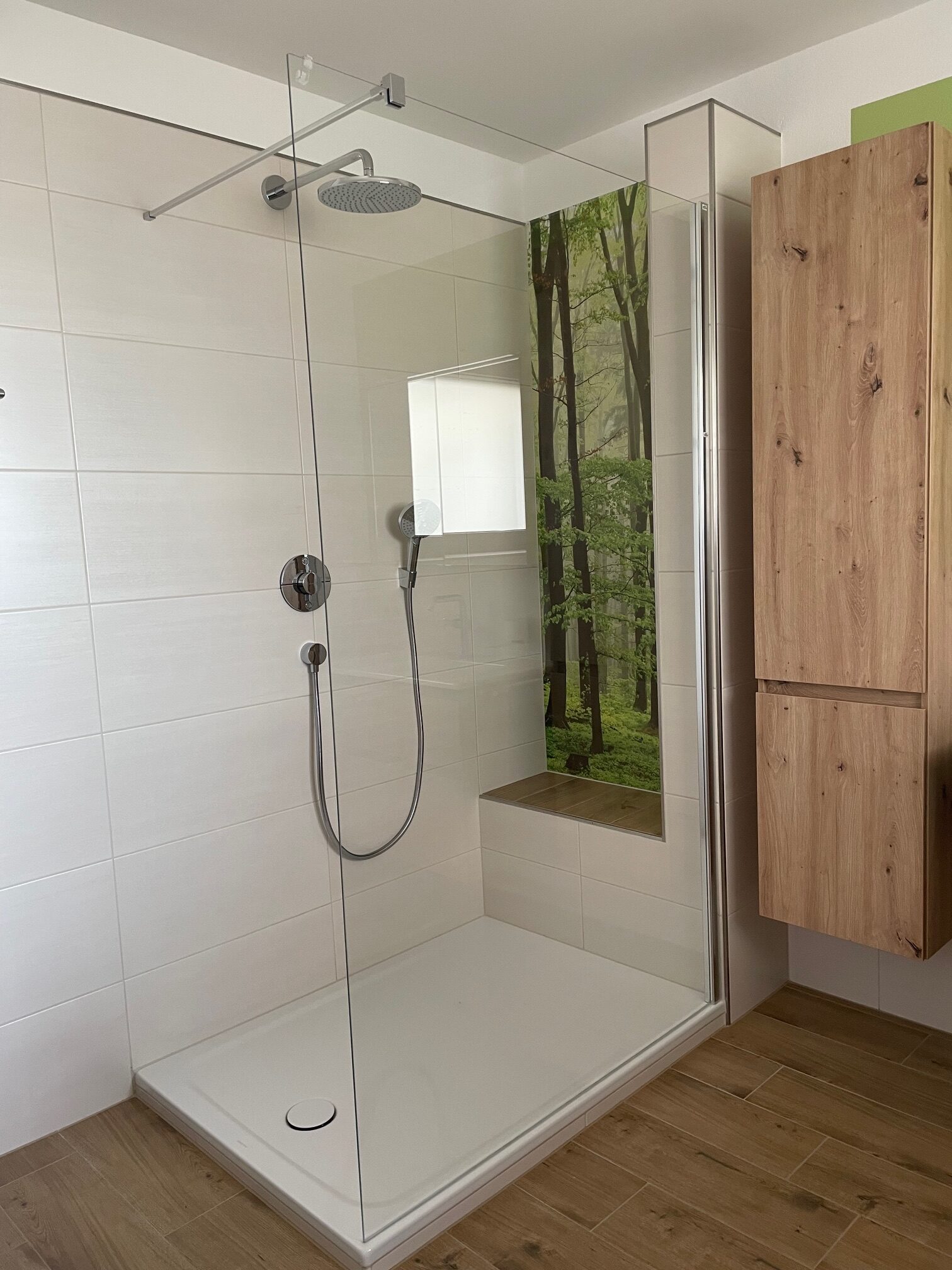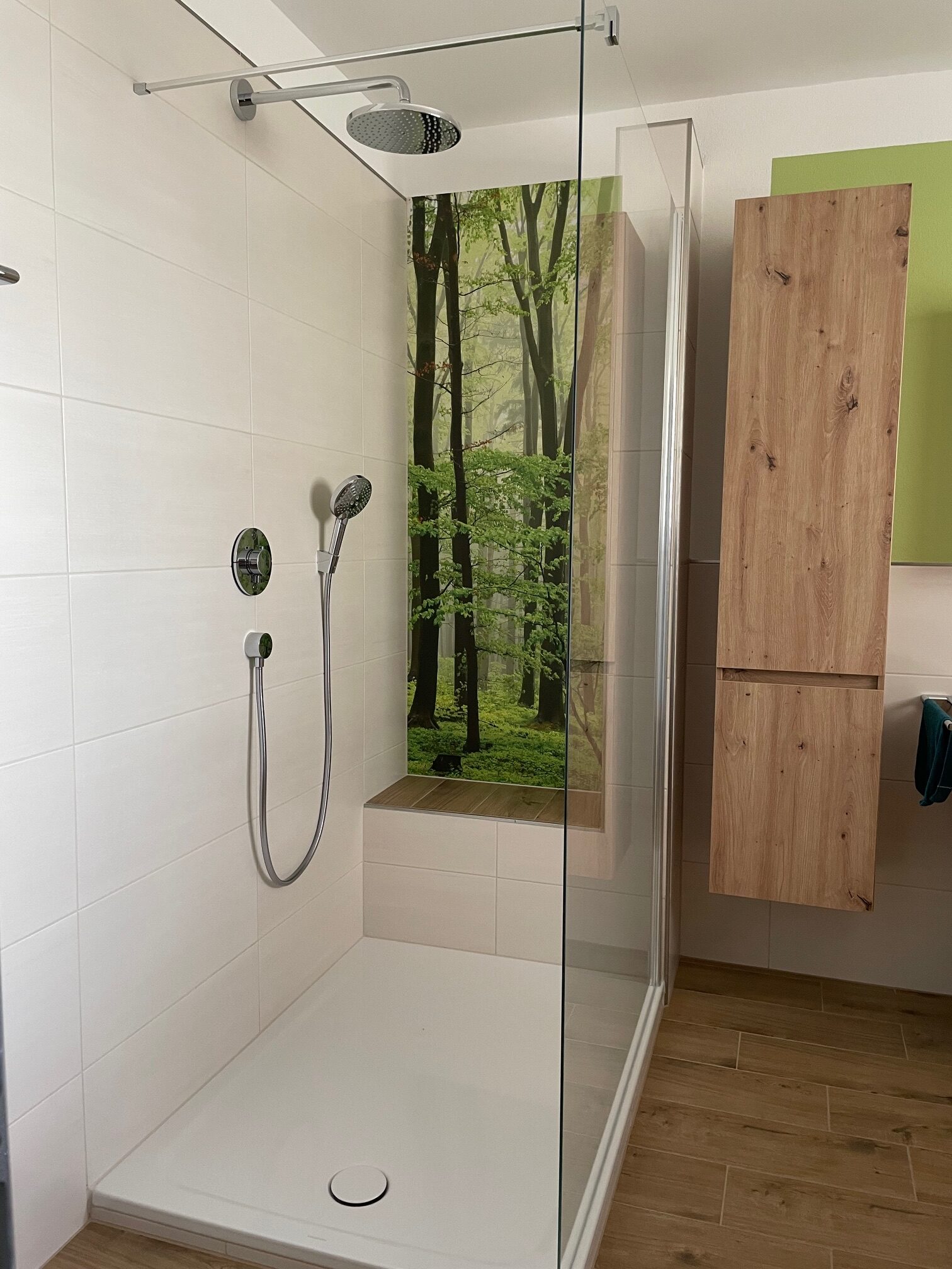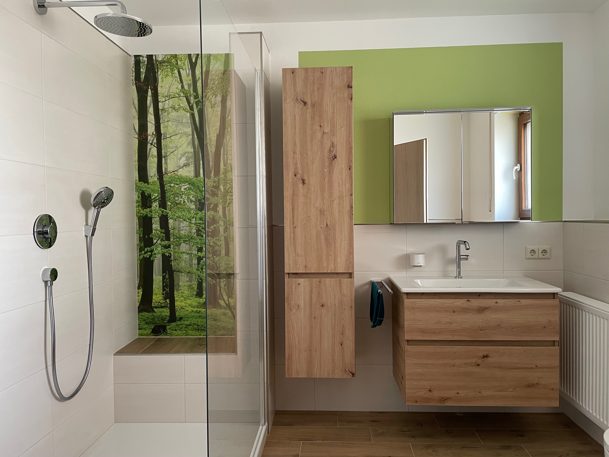 Die jetzt große Dusche mit Sitzgelegenheit, Kopfbrause und dem heiteren Wald-Bild durfte die ursprüngliche Badewanne ersetzen. Stauraum war gefragt, also durften weitere Schränke neben dem Waschtischunterschrank platz finden. Vor allem der Rollcontainer, der sowohl als Sitzgelegenheit als auch zur Sitzgelegenheit dient ist smart.